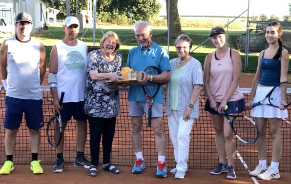 So war es naheliegend, dass ihm die Vereinsvorsitzende Edeltraud Lachner und Tennisabteilungsleiterin Renate Hitz sein Geburtstagsgeschenk auf dem Tennisplatz bei einer Spielpause im Kreise seiner Doppelpartner überreichten und herzlich gratulierten.