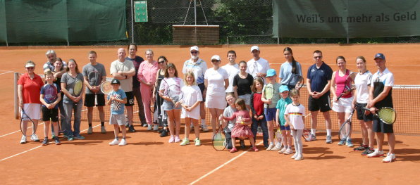 Bei herrlichem Sommerwetter hatten sich rund 20 Personen, darunter viele junge Familien, Anfänger und Wiedereinsteiger auf der Tennisanlage eingefunden, um sich von Steffi, Julia, Renate und Dieter in die Geheimnisse des Tennissports einweihen zu lassen.