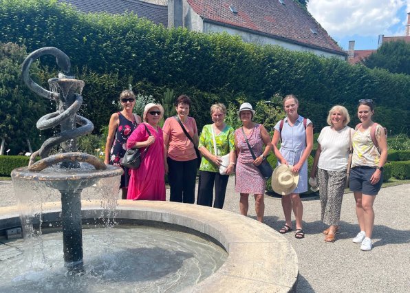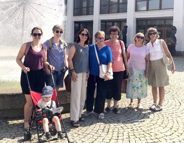 und ließ sich Eis und Eiskaffee schmecken, bevor Kati die Gruppe mit ihrem Bus sicher wieder heimkutschierte. Im Garten der Anatomie stellten sich die Ausflüglerinnen zum Gruppenfoto auf.